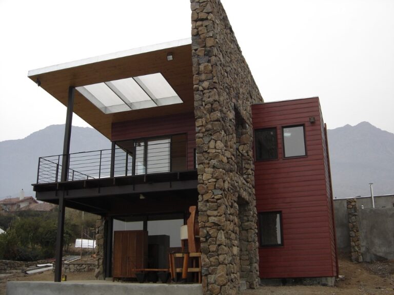Destaca un gran muro costilla revestido en piedra del lugar que delimita sectores funcionales y genera contrastes con el resto de los materiales como tinglado de fibrocemento teñido.