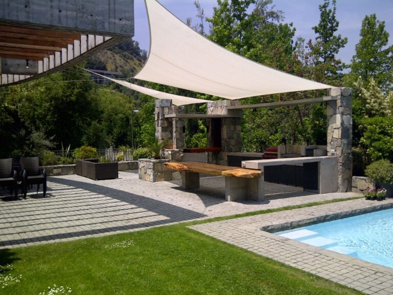 Elementos de madera nativa y toldos vela para sombreamiento.